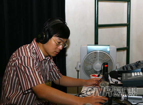 圖為中央臺(tái)技術(shù)人員張旭平在與北京聯(lián)系。 中廣網(wǎng)記者李洪濤 攝