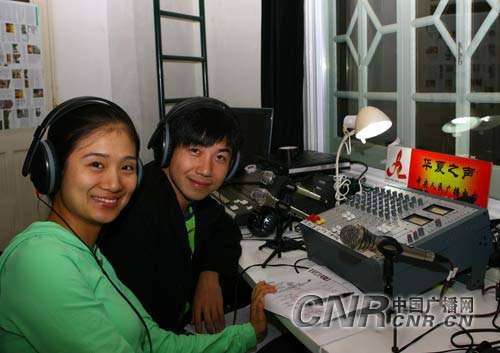 29日,澳門中樂團在澳門西式的崗頂劇院上演了一場中國民樂精品《琴胡笛笙韻凝香》,中央臺華夏之聲對音樂會進行了全程轉播。圖為中央臺華夏之聲主持人小班(男)、宋薇在崗頂劇院直播間中。 中廣網記者李洪濤 攝