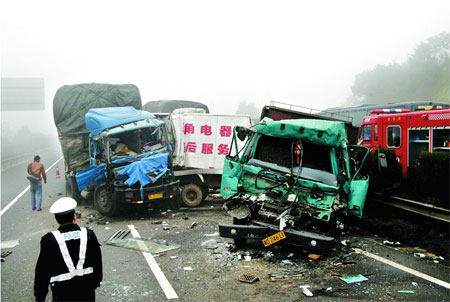 (12月15日上午,大霧天氣能見(jiàn)度降低,京珠高速臨長(zhǎng)段發(fā)生多起汽車追尾事故)