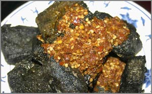 用黃豆為原料的水豆腐,經(jīng)過專用鹵水浸泡半月,再以茶油經(jīng)文火炸焦,佐以麻油,辣醬。它具有"黑如墨,香如醇,嫩如酥,軟如絨"的特點(diǎn),奇在以臭命名,不同于其它食鹵以香自翊。聞起來臭,吃起來香,外焦微脆,內(nèi)軟味鮮。這是因?yàn)辂u水中放有鮮冬筍、瀏陽豆豉、香菇、上等白酒等多種上乘原料,故味道特別鮮香。 |
