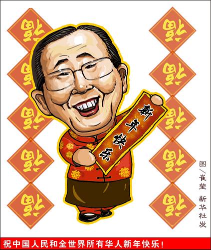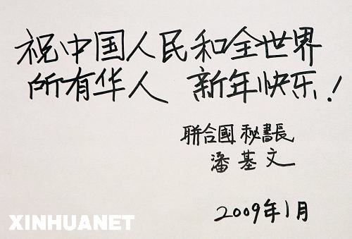 2009年中國(guó)農(nóng)歷新年即將到來之際,聯(lián)合國(guó)秘書長(zhǎng)潘基文1月23日通過新華社發(fā)表祝詞,祝愿中國(guó)人民和全球華人新年快樂。 潘基文親筆用漢字書寫了賀詞:“祝中國(guó)人民和全世界所有華人新年快樂!”新華社發(fā)