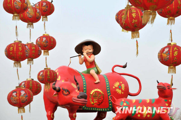 1月16日在北京蓮花池公園拍攝的廟會牛年雕塑《牧童》。隨著春節(jié)臨近,京城各處的春節(jié)廟會、燈會已基本準備就緒。新華社發(fā)