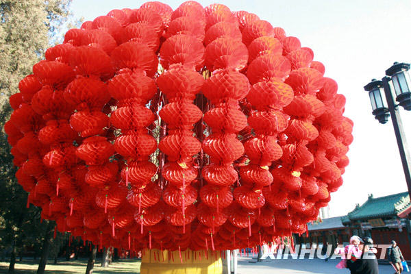 1月14日,游人觀賞北京地壇公園為廟會新安裝的一組巨型燈籠。隨著春節(jié)臨近,京城各處的春節(jié)廟會、燈會已基本準備就緒。新華社發(fā)