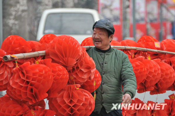 1月16日,一名工人肩挑燈籠在北京龍?zhí)豆珗@為廟會布展。隨著春節(jié)臨近,京城各處的春節(jié)廟會、燈會已基本準備就緒。新華社發(fā)