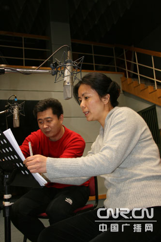 中國之聲主持人王瑩和蘇揚在錄制春節(jié)特別節(jié)目