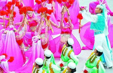 “石頭呀崖上山丹兒花,懸呀懸溜溜地掉下,花兒呀故鄉(xiāng)的尕妹妹,要和你對(duì)答……”8月8日晚,寧夏“花兒”悠揚(yáng)浪漫的曲調(diào)在“鳥巢”里響亮回蕩,由寧夏歌舞團(tuán)創(chuàng)作的《心中的花兒火辣辣》作為奧運(yùn)會(huì)開幕式前的回族歌舞代表作,短短3分鐘的展示贏得滿堂喝彩。 當(dāng)晚6時(shí)許,奧運(yùn)開幕式前文藝展示拉開帷幕,《心中的花兒火辣辣》第17個(gè)登臺(tái)亮相,106名身著華麗回族服飾的演員用輕盈、歡快的表演,讓觀眾領(lǐng)略了回族歌舞的風(fēng)采。奧組委官員贊嘆:“這個(gè)節(jié)目樸實(shí)親切,獨(dú)樹一幟,熱情歌唱了回族人民的幸福生活,讓花兒飛揚(yáng)起耀眼的光芒。” “這難得的3分鐘表演將成為我們寶貴的財(cái)富。”寧夏歌舞團(tuán)團(tuán)長范晉國說,此次奧運(yùn)演出將成為寧夏“花兒”傳承發(fā)展的可貴契機(jī)!。ㄓ浾 李 剛