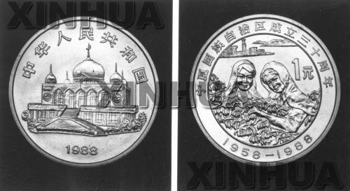 為慶祝寧夏回族自治區(qū)成立30周年,中國(guó)人民銀行發(fā)行紀(jì)念幣一枚。紀(jì)念幣面額一元,直徑30毫米,材質(zhì)為銅鎳合金,色澤為銀白色,與人民幣等值流通使用。紀(jì)念幣正面圖案為銀川市清真寺建筑,背面圖案為兩名回族女青年采摘枸杞子。紀(jì)念幣主要在寧夏回族自治區(qū)發(fā)行。新華社發(fā)