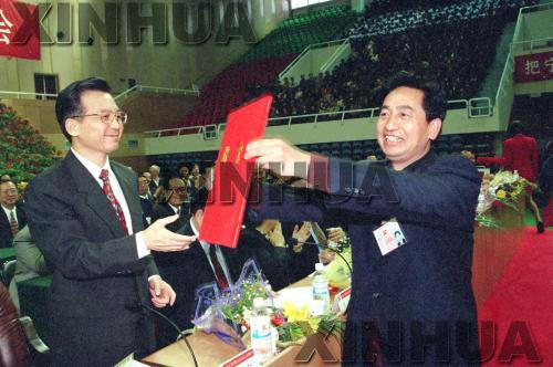 1998年10月25日,寧夏各族各界5000多人在銀川寧夏體育館隆重集會,熱烈慶祝寧夏回族自治區(qū)成立40周年。 中共中央政治局委員、書記處書記、國務(wù)院副總理中央代表團(tuán)團(tuán)長溫家寶出席大會并發(fā)表重要講話。國務(wù)委員兼國務(wù)院秘書長、中央代表團(tuán)副團(tuán)長王忠禹宣讀了中共中央、全國人大常委會、國務(wù)院、全國政協(xié)、中央軍委為慶祝寧夏回族自治區(qū)成立40周年發(fā)來的賀電。 在慶祝大會上,溫家寶將中央代表團(tuán)精簡、節(jié)約下的慶;顒咏(jīng)費交給西海固行署專員馬金虎,用來支持西海固地區(qū)建設(shè)。新華社記者 白連鎖 攝