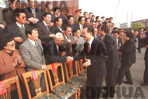 1998年10月24日,以中共中央政治局委員、書(shū)記處書(shū)記、國(guó)務(wù)院副總理溫家寶為團(tuán)長(zhǎng)的中央代表團(tuán),乘專(zhuān)機(jī)抵達(dá)銀川,參加寧夏回族自治區(qū)成立四十周年慶;顒(dòng)。 圖為溫家寶會(huì)見(jiàn)自治區(qū)黨政軍負(fù)責(zé)人現(xiàn)場(chǎng)。新華社記者 劉海峰 攝