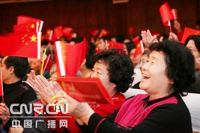 絢麗的舞臺(tái),響亮的歌聲,華彩的表演……在南開大學(xué)師生唱響的膾炙人口的紅歌感染下,在場(chǎng)的數(shù)百名觀眾揮舞著手中的國(guó)旗,并情不自禁地加入到了演唱之中,臺(tái)上臺(tái)下歌聲一片,共同回顧改革開放30年的變遷,為偉大祖國(guó)的繁榮富強(qiáng)喝彩。