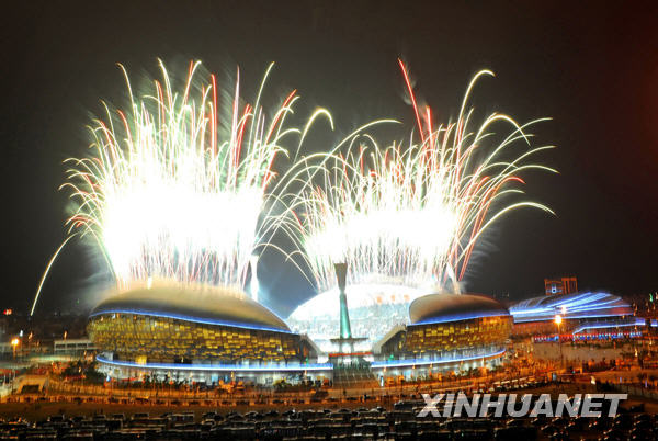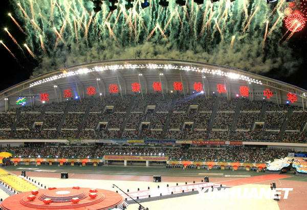 開幕式上的焰火表演。 新華社記者陳飛攝 中廣網(wǎng)北京10月27日消息 10月26日晚,第六屆全國(guó)農(nóng)民運(yùn)動(dòng)會(huì)開幕式在福建省泉州市海峽體育中心體育場(chǎng)舉行。