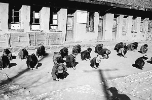 沒有桌椅、買不起紙筆的農(nóng)家孩子,每天蹲在地上用樹枝、石塊學(xué)習(xí)認(rèn)字。圖為上個(gè)世紀(jì)70年代資料圖片。