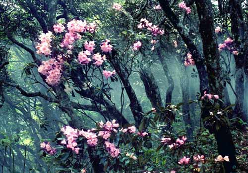舉世罕見的十里杜鵑花長廊綿亙在井岡山的峰脊上,蔚為壯觀。每到春天,在陡峭的山脊上,盛開的杜鵑花就密密匝匝地伸向藍(lán)天。別處的杜鵑是灌木,井岡山的杜鵑卻是喬木,它們每棵都高達(dá)15米以上,干圍1米左右,開出的花朵呈五角形,大的如碗口,小的像鈕扣,有的一棵樹上竟開著幾種顏色的花。