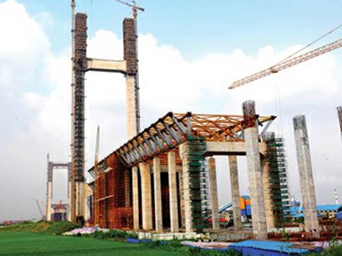 經(jīng)上海建工一建公司建設(shè)者的奮力拼搏,閔浦大橋浦東主塔昨天順利封頂。該橋主跨708米,主塔高度達(dá)214.5米,上層為雙向八車(chē)道,下層為雙向六車(chē)道,是A15高速公路主橋工程,也是黃浦江上第一座雙層斜拉橋。據(jù)悉,浦西主塔也將在10月封頂。