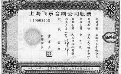 | 1984年11月18日,經(jīng)中國人民銀行上海市分行批準(zhǔn),上海飛樂音響公司成立,并向社會發(fā)行每股面值50元的股票1萬股。這是我國改革開放以來發(fā)行的第一張上市股票。