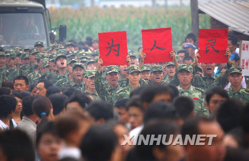 2008年7月20日下午,青川縣木魚鎮(zhèn)的鄉(xiāng)親們在送別抗震救災(zāi)官兵。新華社記者李剛 攝