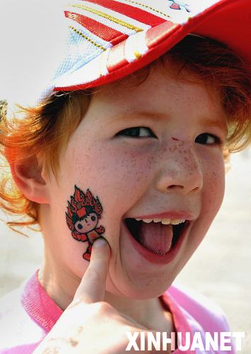 這是2008年8月18日,一名在北京天安門廣場游玩的外國小朋友將“福娃”貼在自己的小臉上向游人展示。新華社記者何俊昌攝