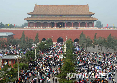 10月1日,游客在北京故宮景區(qū)游覽。“奧運效應(yīng)”使北京“十一”期間旅游市場出現(xiàn)井噴態(tài)勢。 新華社記者 李文 攝