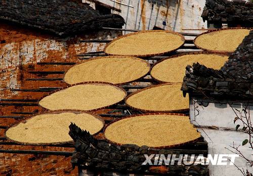 10月2日拍攝的婺源縣農(nóng)村房前屋后晾曬的金燦燦的稻谷。“十一”黃金周正值水稻秋收的繁忙季節(jié),江西省婺源縣許多返鄉(xiāng)的在外務(wù)工人員和留守家中的親人一起投身到收獲秋糧的勞動(dòng)中,農(nóng)家屋頂和木柵上曬滿了金黃的稻谷,與徽派民居構(gòu)成了一幅幅美麗的“曬秋”畫卷。新華社發(fā)(王國紅 攝)