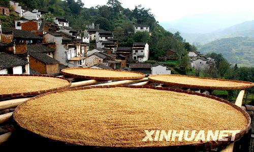 10月2日拍攝的婺源縣農(nóng)村房前屋后晾曬的金燦燦的稻谷。新華社發(fā)(王國紅 攝)