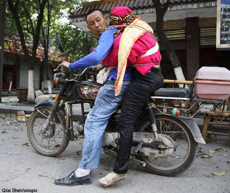 2008年5月14日,吳家方騎摩托車從漢旺鎮(zhèn)把妻子接回家,那張名為《給妻子最后的尊嚴》的照片,那對摩托車上綁在一起的生死不離的夫妻,深深感動了世界。 |