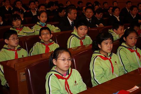 現(xiàn)場排坐整齊的小學(xué)生