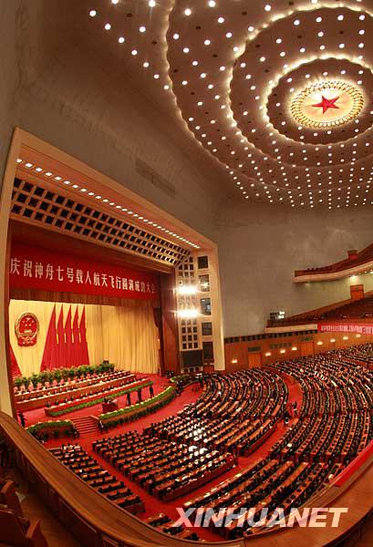 中廣網(wǎng)北京11月7日消息 中共中央、國務(wù)院、中央軍委在北京人民大會堂舉行慶祝神舟七號載人航天飛行圓滿成功大會現(xiàn)場。新華社記者 龐興雷 攝