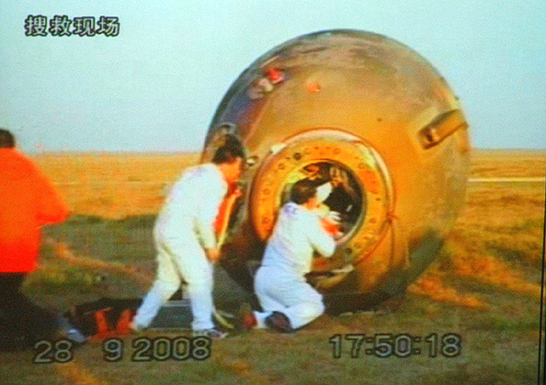9月28日,神七返回艙艙門打開。 新華社發(fā)(電視截圖)