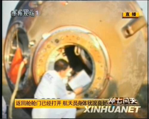 9月28日,神七返回艙門打開。新華社發(fā)(電視截圖)