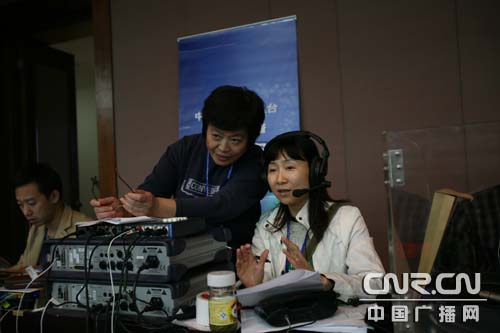 主持人方舟與北京航天城直播組領(lǐng)隊(duì)何端端探討直播任務(wù)(記者南光 曹囡囡 攝)