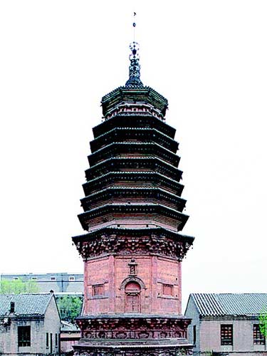 渾源圓覺寺塔(金代)平面呈等邊八角形,密檐式,九層,全部磚砌,高30米。