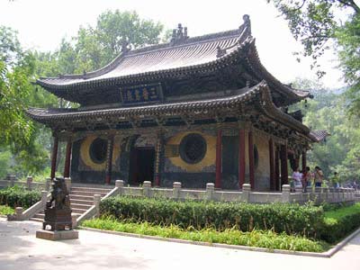 穿過對越坊及鐘樓、鼓樓就到了獻(xiàn)殿。此殿原為陳設(shè)祭品的場所,始建于金大定八年(1168年),面寬三間,深兩間,梁架很有特色,只在四椽袱上放一層平梁,既簡單省料,又輕巧堅固。殿的四周除中間前后開門之外,均筑堅厚的檻墻,上安直柵欄,使整個大殿形似涼亭,顯得格外利落空敞。獻(xiàn)殿于一九五五年用原料按原式樣翻修,保持了金代建筑特點,是我因古建中的瑰寶。