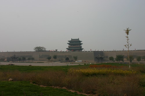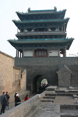 平遙古城,與同為第二批國家歷史文化名城的四川閬中、云南麗江、安徽歙縣并稱為“保存最為完好的四大古城”。今山西省平遙縣舊稱“古陶”。明朝初年,為 防御外族南擾,始建城墻,洪武三年(公元一三七零年)在舊墻垣基礎(chǔ)上重筑擴(kuò)修,并全面包磚。以后景德、正德、嘉靖、隆慶和萬歷各代進(jìn)行過十次在的補(bǔ)修和修葺,更新城樓,增設(shè)敵臺?滴跛氖辏ü黄吡闳辏┮蚧实畚餮猜方(jīng)平遙,而筑了四面大城樓,使城池更加壯觀。平遙城墻總周長6163米,墻高約12米,把面積約2.25平方公里的平遙縣城一隔為兩個風(fēng)格迥異的世界。城墻以內(nèi)街道、鋪面、市樓保留明清形制;城墻以外稱新城。這是一座古代與現(xiàn)代建筑各成一體、交相輝映、令人遐思不已的佳地。明信片的主圖再現(xiàn)了這一風(fēng)采。