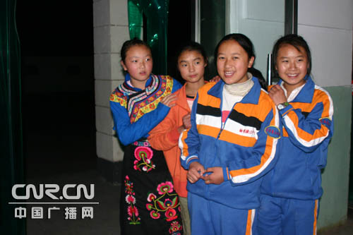 幾個來自汶川的羌族女孩兒。穿民族服裝的小女孩剛參加完學(xué)校的文藝演出。