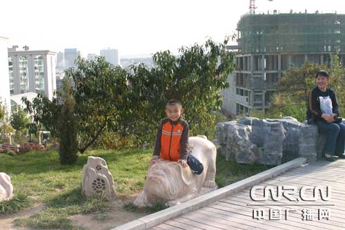 陽(yáng)泉市民帶著孩子在原是矸石山改造而成的公園里玩耍