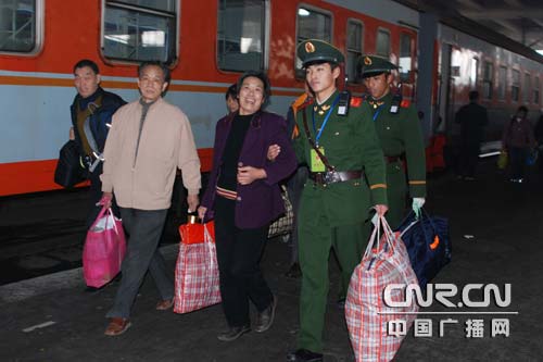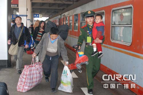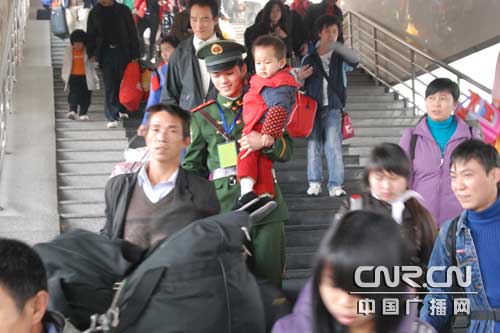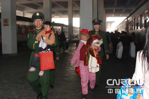 中廣網(wǎng)福州1月21日消息 21日,福州市火車站迎來了節(jié)前返鄉(xiāng)的學(xué)生流、民工流高峰,擔(dān)負(fù)春運(yùn)執(zhí)勤任務(wù)的武警福建總隊(duì)直屬支隊(duì)官兵在維護(hù)好各執(zhí)勤點(diǎn)秩序的同時(shí),積極扶老攜幼,為旅客提供幫助。(曾朝群)