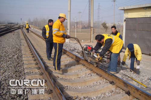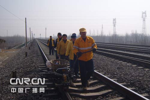 中廣網(wǎng)鄭州1月22日消息(記者胡曉輝 通訊員袁鑫)每年春運(yùn),當(dāng)人們都著急回家和家人團(tuán)圓的時(shí)候,鐵路養(yǎng)護(hù)維修員們卻在為確保春運(yùn)安全堅(jiān)守在鐵路一線。河南省臺(tái)前縣鐵路養(yǎng)護(hù)維修員李峰就是其中的一員,早上天蒙蒙亮,在地處國(guó)家級(jí)貧困縣的河南省臺(tái)前縣,鐵路養(yǎng)護(hù)維修員李峰正拿著鑰匙,打開(kāi)進(jìn)入鐵路養(yǎng)護(hù)的大門。臺(tái)前機(jī)工區(qū)位于京九鐵路提速段,是整個(gè)京九線提速區(qū)段,客車經(jīng)過(guò)此地的平均速度達(dá)到每小時(shí)160公里。李師傅說(shuō),為了確保春運(yùn)期間列車的行駛安全,他們?cè)谶@里經(jīng)常一呆就是一整天,李峰說(shuō):“為了確保春運(yùn)期間,列車的安全平穩(wěn)、保暢通,我們現(xiàn)在6點(diǎn)半就正式上線路了,下午是一直干到天黑,整個(gè)的設(shè)備線太長(zhǎng),保證不了暢通,稍微出點(diǎn)故障,對(duì)春運(yùn)就造成不良影響了。”
