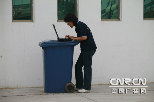 中央臺記者明慧在報(bào)道組行進(jìn)間隙做連線報(bào)道—中廣網(wǎng)記者柴安東攝