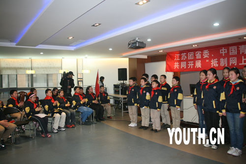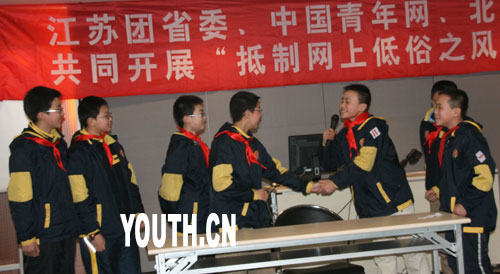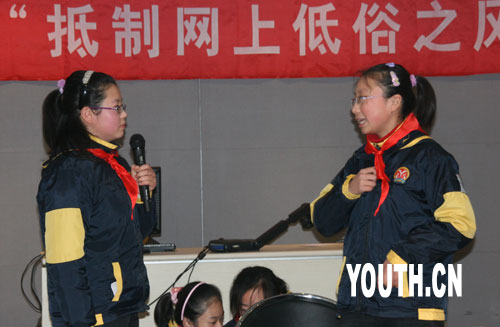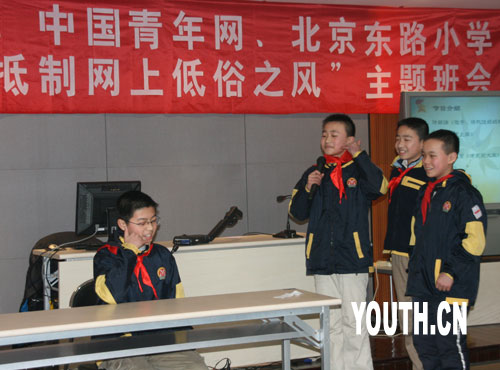 | 中廣網(wǎng)北京2月25日消息 “網(wǎng)絡(luò)魅力大,神奇不可言。低俗不要碰,黃頁不入眼。求知是目的,游戲莫貪玩。上網(wǎng)要節(jié)制,健康是本錢。”這是江蘇省南京市北京東路小學(xué)六一中隊(duì)的同學(xué)們今天在“抵制網(wǎng)上低俗之風(fēng)”主題班會(huì)上面向全校同學(xué)們發(fā)出的倡議,也是他們給自己定下的健康上網(wǎng)文明公約。由此,本網(wǎng)參與主辦的“抵制網(wǎng)上低俗之風(fēng)”系列主題班會(huì)拉開帷幕。