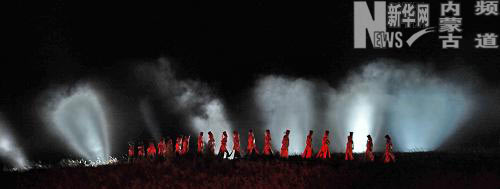 草原上的實景演出展示親人思念遠(yuǎn)征將士的場景(8月15日攝)。演繹成吉思汗戎馬一生的大型實景演出近期在內(nèi)蒙古呼倫貝爾草原上演,實景演出在戶外的天然草原上搭建了100多個蒙古包、2000多米的天際線和500多個數(shù)碼音響設(shè)備,由600多名身著民族服裝的演員以及100多匹駿馬和巨大的羊群出演,營造出氣勢宏大的天然草原劇場。60分鐘的演出分為序幕、降生、征戰(zhàn)、思念、大典等八個部分,展示了成吉思汗從出生到故去的宏大的歷史故事,同時也展示了蒙古族的歷史、文化、生產(chǎn)和生活習(xí)俗。新華社記者 李欣 攝