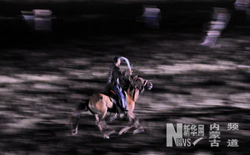 草原上的實景演出中展示部落爭斗的場景(8月15日攝)。演繹成吉思汗戎馬一生的大型實景演出近期在內(nèi)蒙古呼倫貝爾草原上演,實景演出在戶外的天然草原上搭建了100多個蒙古包、2000多米的天際線和500多個數(shù)碼音響設(shè)備,由600多名身著民族服裝的演員以及100多匹駿馬和巨大的羊群出演,營造出氣勢宏大的天然草原劇場。60分鐘的演出分為序幕、降生、征戰(zhàn)、思念、大典等八個部分,展示了成吉思汗從出生到故去的宏大的歷史故事,同時也展示了蒙古族的歷史、文化、生產(chǎn)和生活習(xí)俗。新華社記者 李欣 攝
