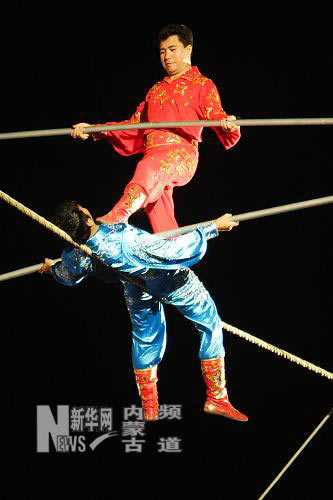 8月16日,有“高空王子”之稱的阿迪力(上)與徒弟在閉幕式上為觀眾表演。當(dāng)日,第七屆內(nèi)蒙古自治區(qū)少數(shù)民族傳統(tǒng)體育運(yùn)動(dòng)會(huì)在鄂爾多斯市閉幕。新華社記者鄭煥松攝