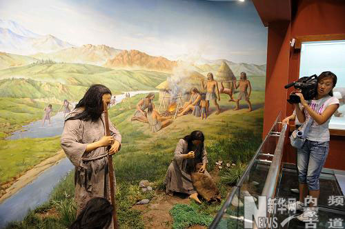 8月3日,一名工作人員在即將開放的赤峰博物館內拍攝遠古紅山文化先民生產(chǎn)生活復原場景效果圖。