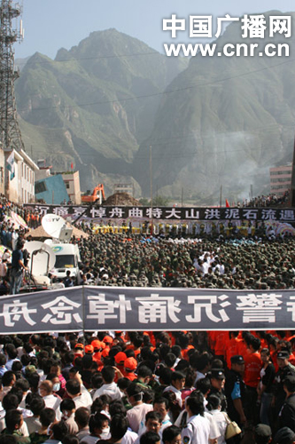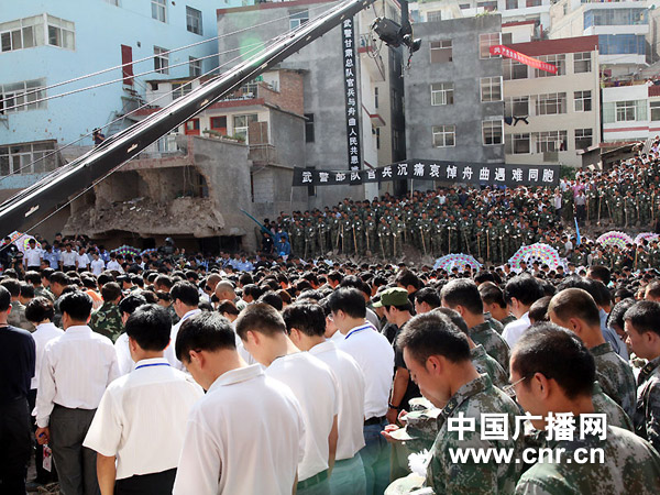 8月15日,人們在舟曲泥石流災(zāi)害現(xiàn)場舉行哀悼活動。當(dāng)日上午10時,舟曲特大山洪泥石流災(zāi)害哀悼活動在舟曲縣城關(guān)鎮(zhèn)東街村泥石流災(zāi)害發(fā)生現(xiàn)場舉行。中廣網(wǎng)記者汪群均 攝