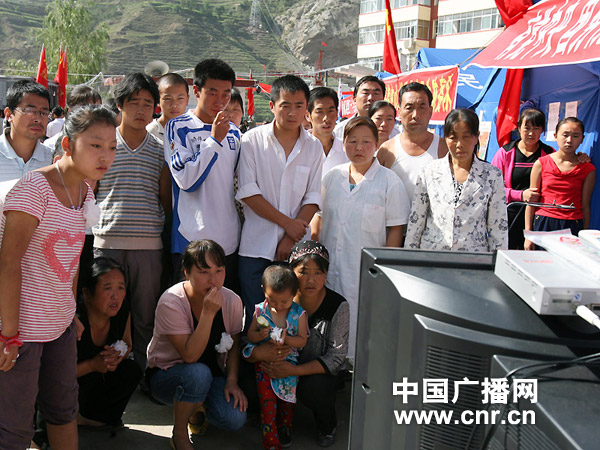 8月15日,在舟曲一中安置點,大量不能去現(xiàn)場的災(zāi)區(qū)群眾圍在電視旁關(guān)注哀悼活動的直播。中廣網(wǎng)記者紀樂樂 攝