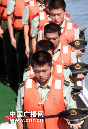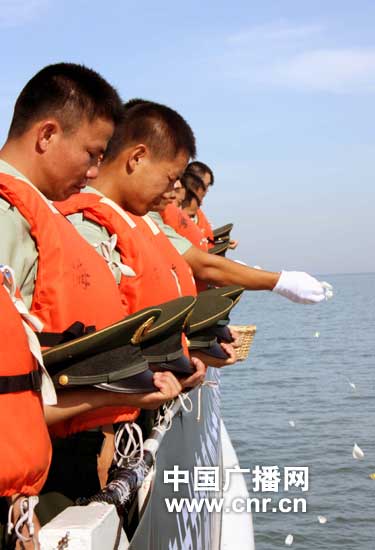 “脫帽!向甘肅舟曲特大山洪泥石流遇難同胞默哀!”隨著指揮員的一聲令下,汽笛劃破長空,國旗徐徐下降,官兵在巡邏艇上莊嚴肅立,脫帽默哀3分鐘,沉重的警報聲在天空久久回蕩,訴說著海警官兵對甘肅舟曲特大山洪泥石流遇難同胞的無盡哀思。隨后,官兵們在海上將一片片花瓣灑向大海,美麗的花瓣隨著浪花漂進無盡的大海,寄托著海警官兵對遇難同胞的無限思念,為災(zāi)區(qū)人民默默祈福。