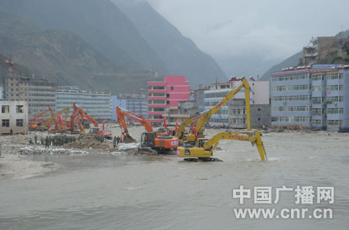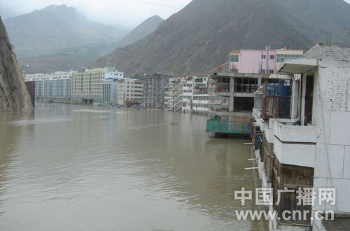 目前舟曲縣城的濱江道還在水面以下(中廣網(wǎng)記者馬喆 攝)