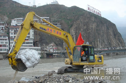 武警水電部隊的大型挖掘機(jī)械已推進(jìn)至白龍江中心進(jìn)行清淤工作 正采用”投石擠淤“的方式清除堰塞體(中廣網(wǎng)記者馬喆 攝)