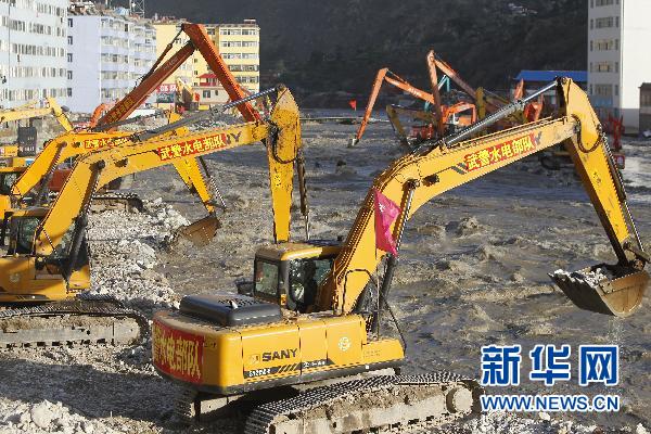 8月19日,武警水電部隊二總隊官兵操作大型挖掘機奮戰(zhàn)在舟曲災區(qū)堰塞湖排險一線。受8月18日甘肅舟曲災區(qū)普降中雨影響,舟曲縣城堰塞湖水位下降緩慢,擔負排險任務的武警部隊和解放軍官兵加大大型機械和人工的投放力度,為降低堰塞湖水位持續(xù)奮戰(zhàn)。