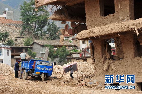 8月22日,三眼峪溝地區(qū)的一座危樓旁,居民從房?jī)?nèi)清理出物件準(zhǔn)備運(yùn)走。